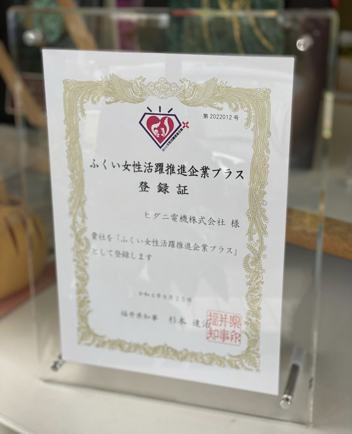 ヒダニ電機株式会社はこの度、2022年8月25日に【ふくい女性活躍推進企業プラス+】として登録いたしました。